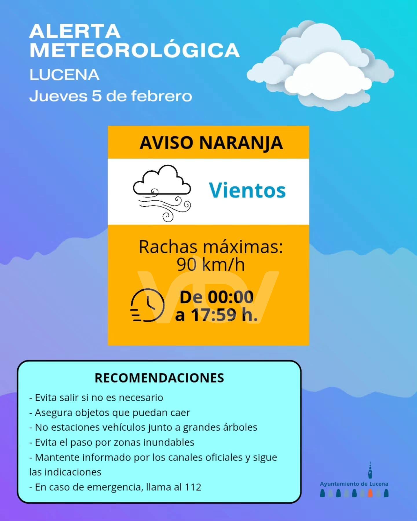 El ayuntamiento de Lucena ha informado que AEMET ha elevado a Aviso Naranja por viento durante la jornada de este jueves en Lucena. Además, el consistorio lucentino ha dado a conocer que permanece cortada la carretera de la pedanía lucentina de Jauja a Badolatosa.