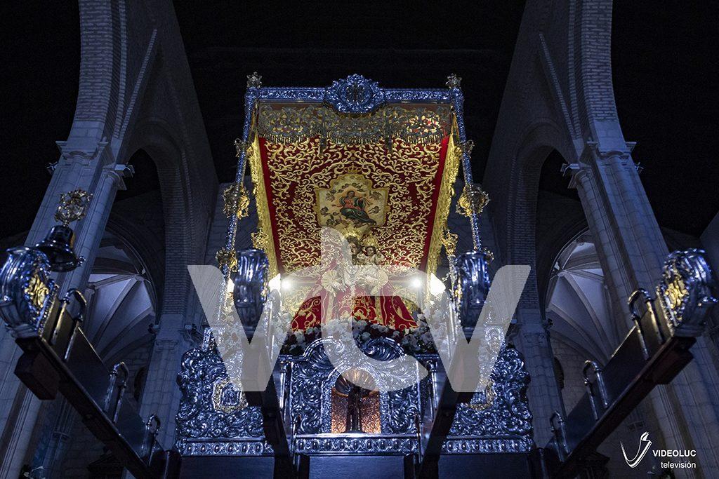 Y la Virgen, al dar las seis de la tarde de su triunfal día, nos espera. Las puertas de San Mateo se abren de par en par y, Ella, espera sobre su trono para acoger a sus hijos que, dichosos, acuden a su llamada. Es la espera final antes de su gloriosa salida a las ocho en punto de la tarde.