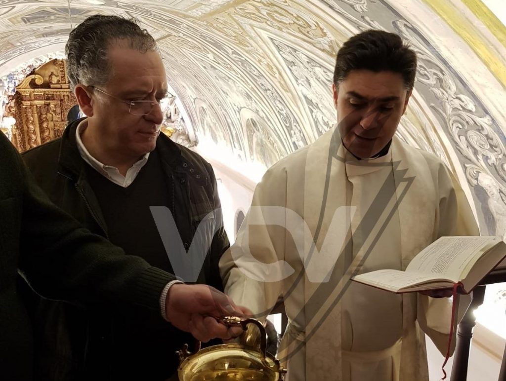 El vicario episcopal de la Campiña, David Aguilera Malagón, ha bendecido este domingo el columbario provisional instalado en el Coro del Real Santuario de Aras para acoger los restos de quienes hayan adquirido un columbario mientras concluyen las obras.