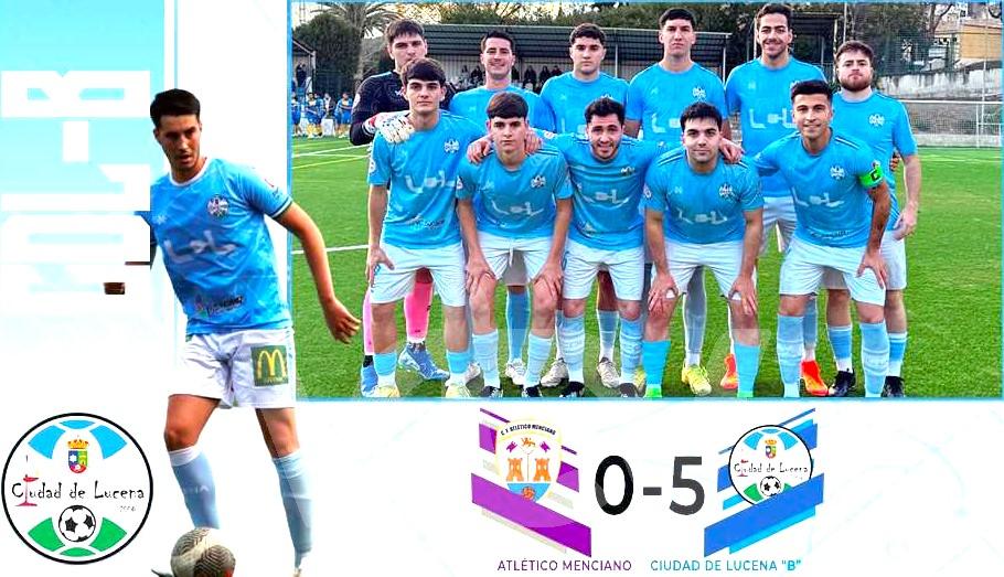 El CD Ciudad de Lucena B se impuso con mucha autoridad al Atlético Menciano, en una complicada salida que el conjunto celeste solventó con un doblete de Antonio Fernández en el primer tiempo; un tercer gol de Juanma Trujillo, en el comienzo del segundo periodo, y otro doblete de Cristian en los minutos finales para cerrar la goleada.