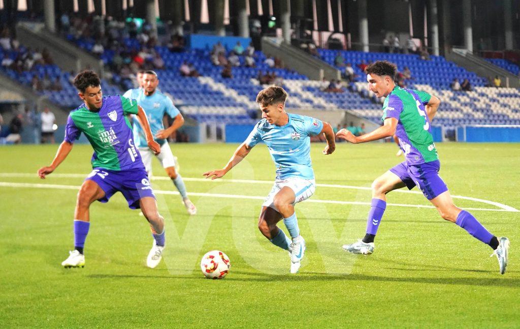 El equipo que dirige Antonio Jesús Cobos comenzó el choque con varias situaciones de gol para sus tres delanteros, Jairo Morillas, David Agudo y Alex Bonilla, aunque, en todos los casos, les faltó contundencia en el remate. Por el contrario, en su segunda aproximación al área, el filial malaguista consiguió adelantarse en el marcador, en el minuto 15, con un penalti transformado por Chupete.