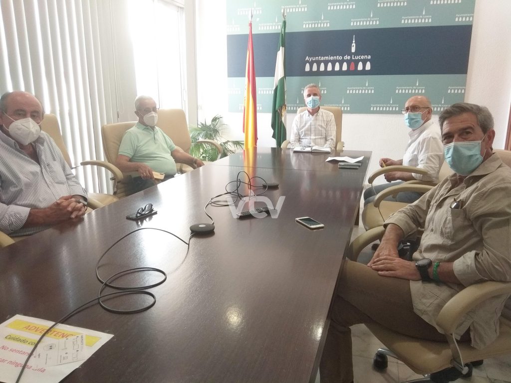 El Ayuntamiento de Lucena ha acogido una reunión entre el alcalde, Juan Pérez, y el concejal de Agricultura, Lucas Gómez, y representantes del sector oleícola para coordinar las acciones preventivas de la covid-19 a poner en marcha en la inminente campaña de recogida de aceituna.