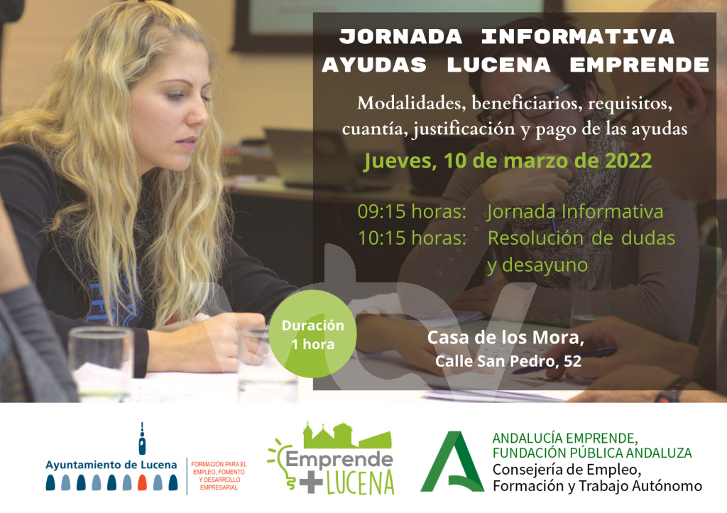La Concejalía de Formación para el empleo, Fomento y Desarrollo Económico ha convocado para el jueves 10 de marzo una jornada informativa sobre las ayudas Lucena Emprende, cuyo plazo de presentación de solicitudes está abierto hasta el 29 de marzo.