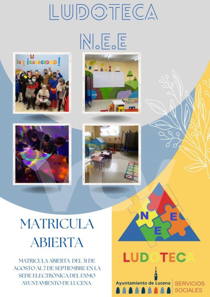 El Ayuntamiento de Lucena, a través de la Concejalía de Servicios Sociales y Salud, ha informado sobre el inicio del período de matriculación para las Ludotecas de Necesidades Educativas Especiales (NEE) 2022-2023, que arrancan el próximo 31 de agosto, que se desarrollarán durante el curso escolar en las instalaciones municipales de la calle Jaén.