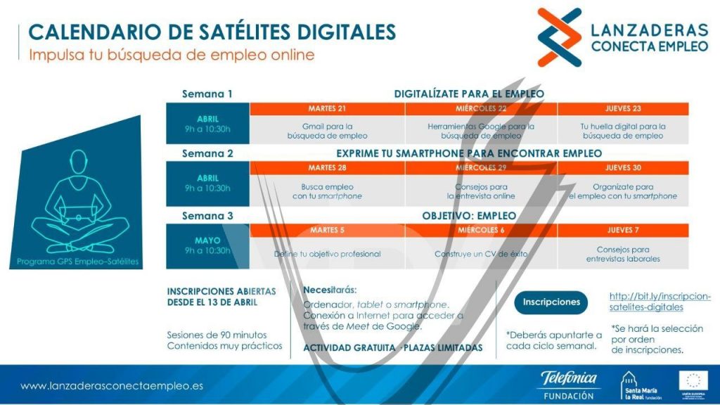 ‘Satélites Digitales’ incluirá nueve sesiones formativas online, que se impartirán a través de videoconferencias los martes, miércoles y jueves, en horario de 9 a 10:30 horas. Las nueve sesiones están agrupadas en tres grandes bloques de contenidos: Digitalízate para el Empleo; Exprime tu smartphone para encontrar empleo; y Objetivo Empleo.