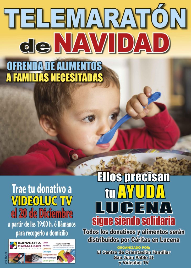 Un año más el Centro de Orientación Familiar “San Juan Pablo II” de Lucena en colaboración con Videoluc TV organiza el próximo día 20 de Diciembre el tradicional Telemaratón solidario a beneficio de las Cinco Cáritas de Lucena. Desde del C.O.F. de Lucena queremos hacer un llamamiento a todos los ciudadanos para que un año más colaboren en esta causa solidaria y aporten su donativo generoso el próximo día 20 de Diciembre en Videoluc TV o el día 21 en las instalaciones del C.O.F. sito en la calle Maristas de Lucena.