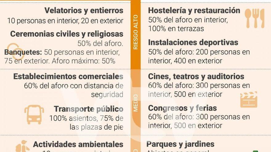En este sentido, se establece que las celebraciones civiles y religiosas pueden contar con un 50 por ciento de aforo y en los banquetes se permiten 50 en interior y 75 en exterior.