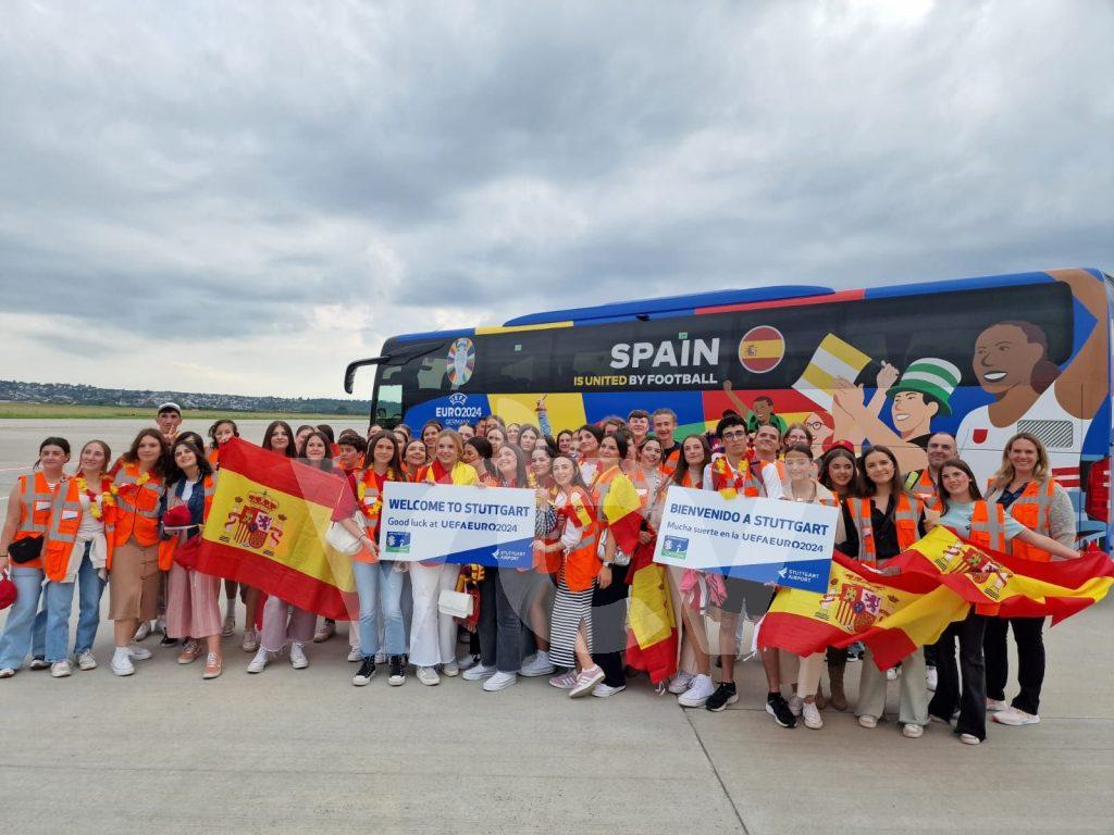 Un grupo de alumnos acompañados del director del instituto lucentino, José Fernando Lavela y de distintos profesores recibieron a la Federación Española de Fútbol a su llegada a Stuttgart donde les obsequiaron con un velón lucentino y un regalo del instituto Marqués de Comares.