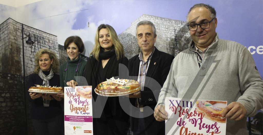 El Ayuntamiento de Lucena, promotor de esta iniciativa desde su primera edición para impulsar el atractivo histórico de la ciudad en unas fechas tan especiales, ha sido el escenario para acoger la presentación del XVIII Roscón de Reyes Gigante Solidario, protagonizada el alcalde, Juan Pérez; la concejal de Servicios Sociales y Salud, Carmen Gallardo; varias representantes del colectivo Annes, Mª del Mar Toro y Ana Almagro; y Agustin Graciano, gerente de la panadería Nuestra Señora de Araceli, responsable del dulce.