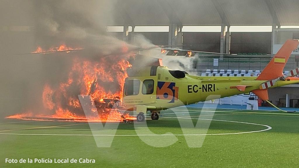 Los hecho se produjeron a primera hora de la tarde del pasado sábado cuando el helicóptero del 061 acudió a trasladar a un enfermo que había sufrido una cardiopatía. Un escape de oxígeno en la cabina parece que fue la causa de la explosión y posterior incendio del aparato.