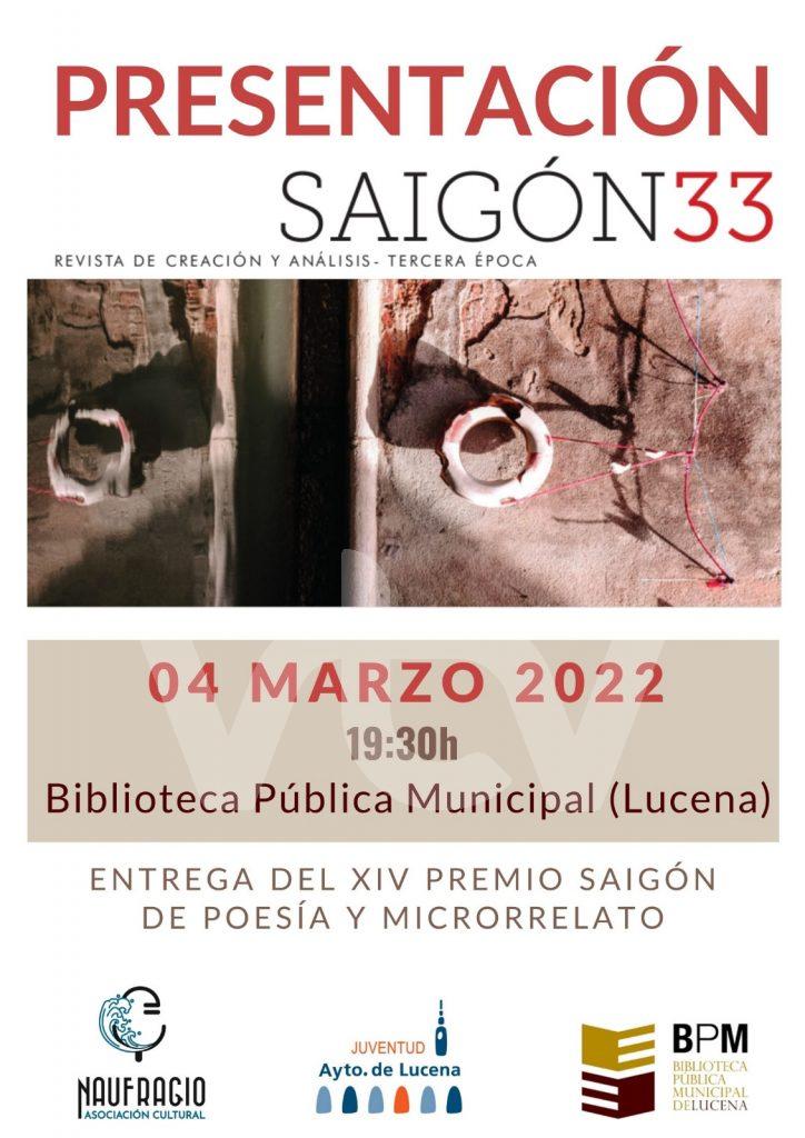La Asociación Cultural Naufragio presenta este viernes 4 de marzo a las siete y media de la tarde en la Biblioteca Pública Municipal de Lucena el número 33 de la revista de creación y análisis ‘Saigón’ y hará entrega del XIV Premio ‘Saigón de Literatura. La actividad está organizada junto con la Delegación de Juventud del Ayuntamiento de Lucena.