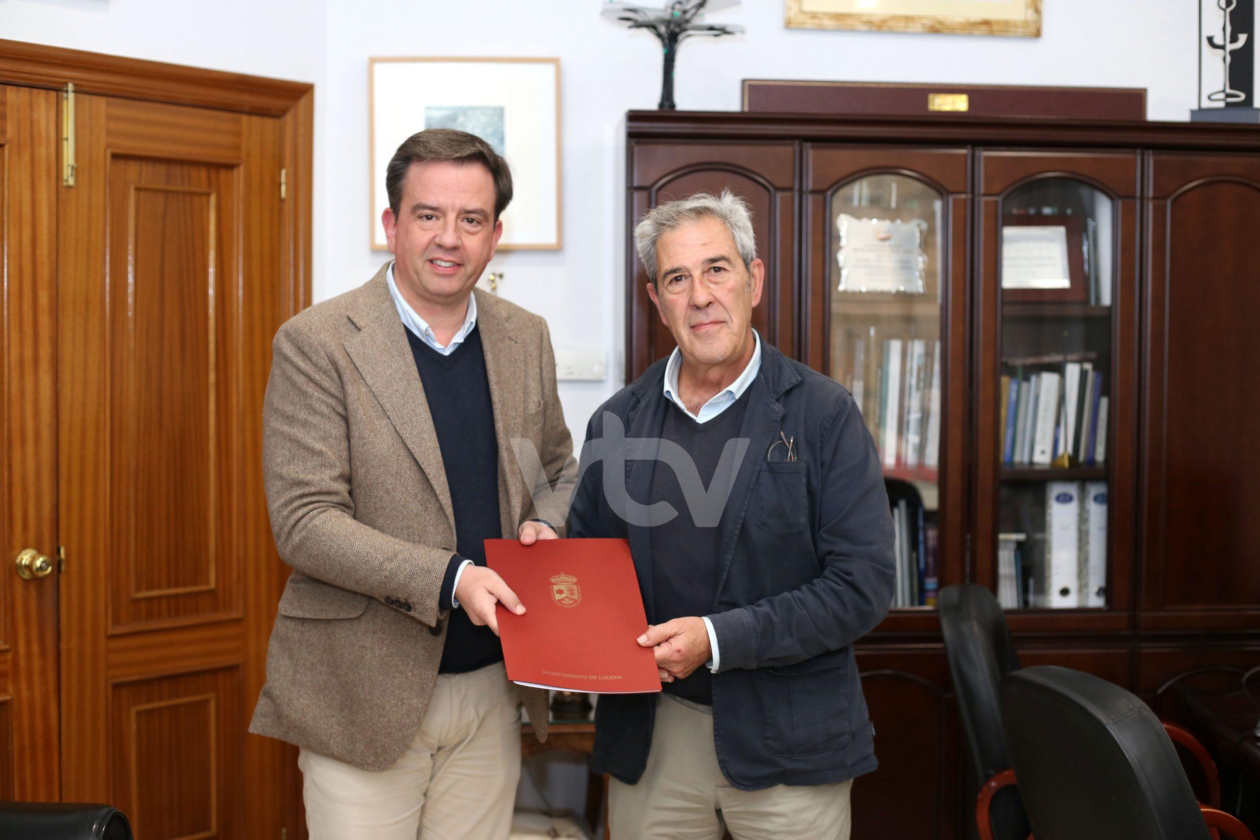 El presidente de la entidad, Francisco de Mora y el alcalde de Lucena, Aurelio Fernández, firmaban el convenio de colaboración