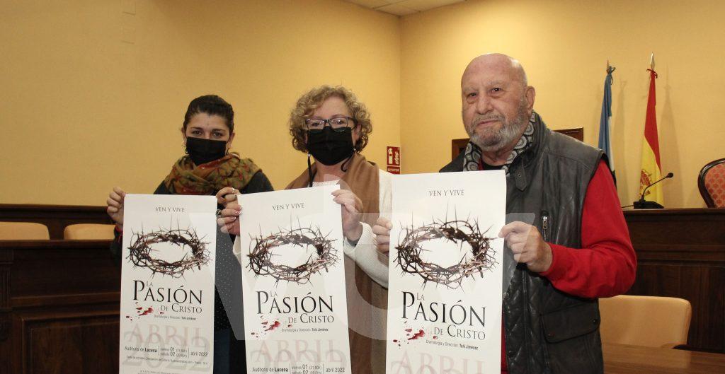Mamen Beato, concejala de Cultura, y la directora de la obra, Toñi Jiménez, y el actor Isidro Arroyo han sido los encargados de presentar esta nueva iniciativa teatral que ponen en escena un equipo de 55 personas, entre actores y actrices, músicos y cantantes y el personal técnico, que vienen a “hacer realidad un evento que viene a cubrir un hueco que existía en la Cuaresma de Lucena”.