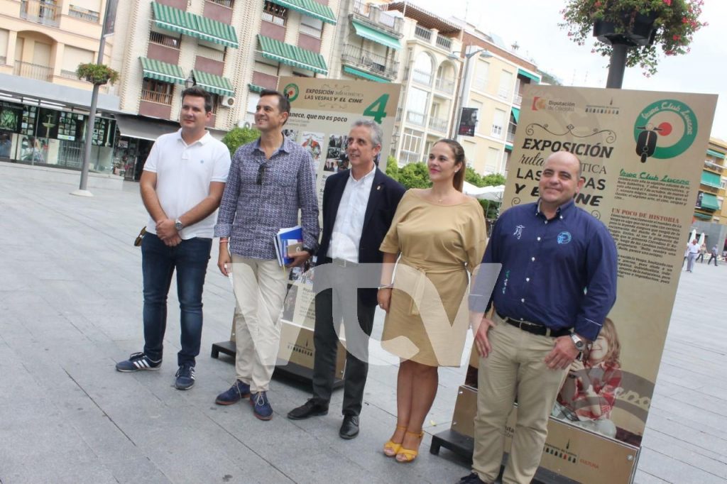 El alcalde de Lucena, Juan Pérez, la diputada de Participación Ciudadana, Aurora María Barbero, y el presidente del Vespa Club Lucena, José Tubío han presentado la exposición “Vespas y cine” formada fotogramas de películas donde la vespa, el scooter y la lambreta tienen un protagonismo especial.