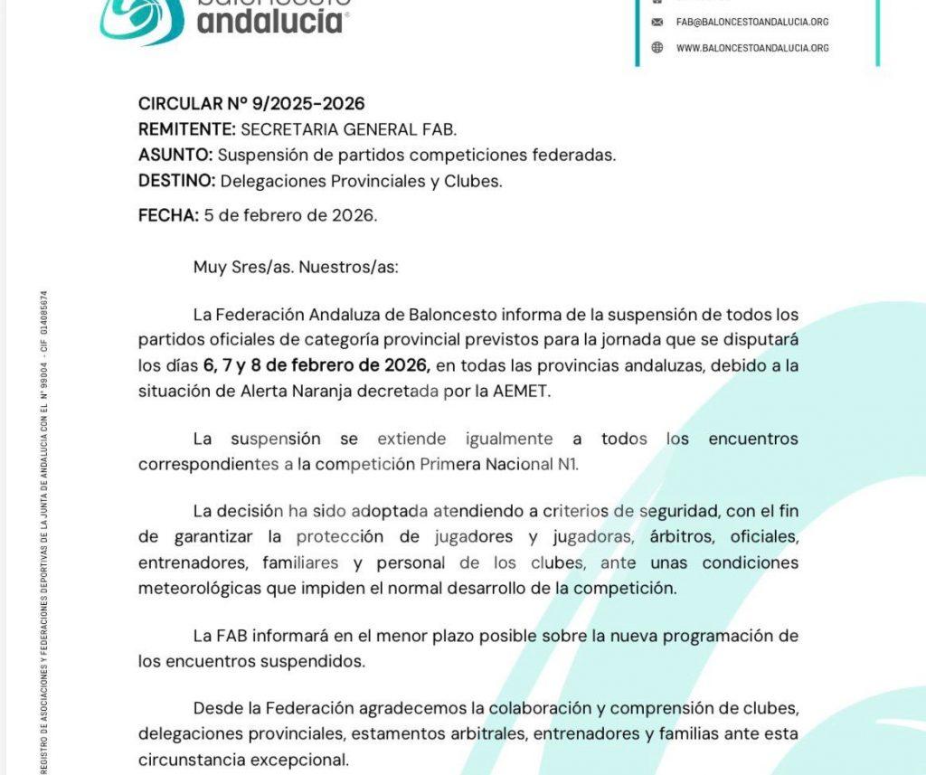 Nos han hecho llegar un comunicado donde se nos indica que la federación andaluza de baloncesto suspende la jornada de este próximo fin de semana debido a la alerta naranja decretada por la AEMET.