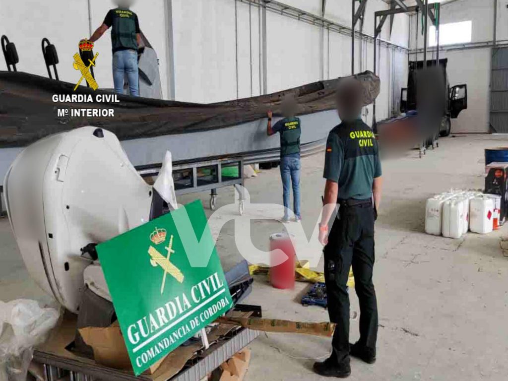 En la inspección practicada en la nave, la Guardia Civil localizó una embarcación neumática semirrígida de 12 metros de eslora, de las habitualmente utilizadas por el narcotráfico para el trasporte de la droga, otra de estas embarcaciones en fase de construcción, tres motores fuera borda, un camión cargado con otros tres motores fueraborda de 300 C.V. cada uno, empaquetados y preparados para su descarga, otro camión tipo tráiler con cabeza tractora y remolque, así como todo el material y maquinaria necesario para la construcción de la segunda embarcación y la instalación de dichos motores.