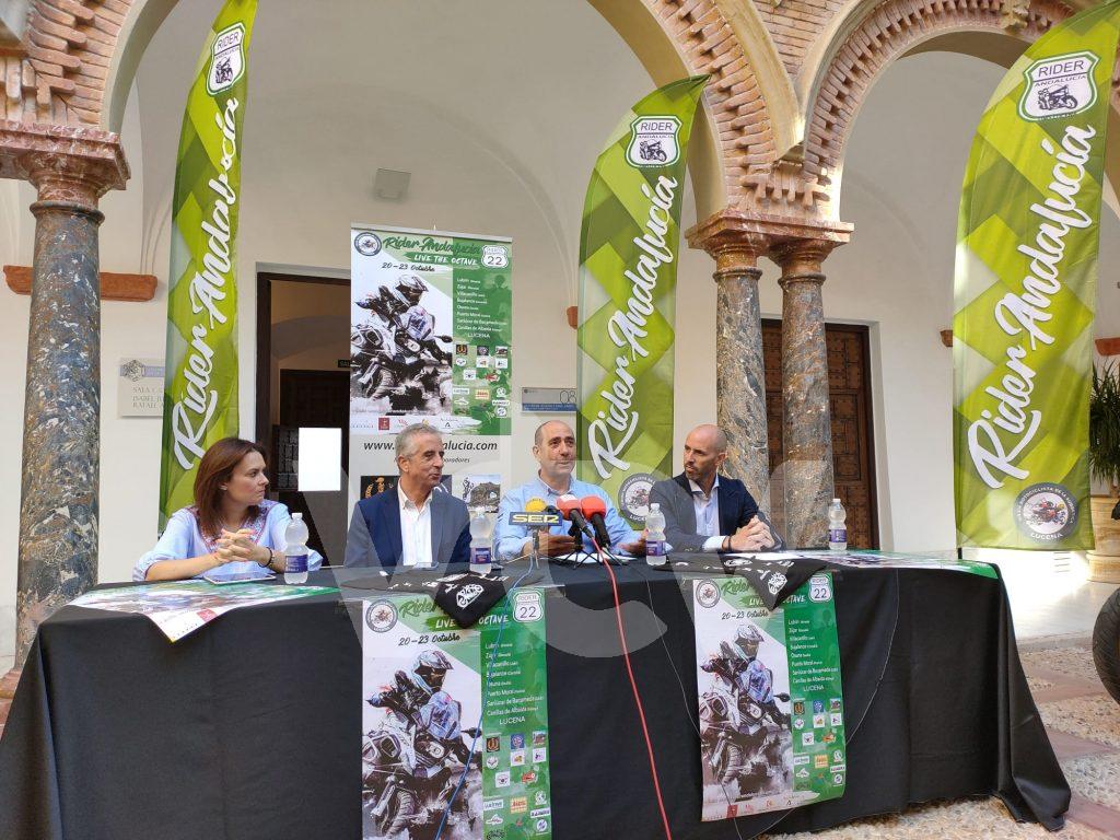 Al acto de presentación de la Rider 2022, que ha tenido lugar en el Palacio de los Condes de Santa Ana, han asistido, además del presidente del club organizador, Rafael González, el delegado territorial de Turismo, Eduardo Lucena, la delegada de Turismo de diputación, Inmaculada Silas y el alcalde de Lucena, Juan Pérez.