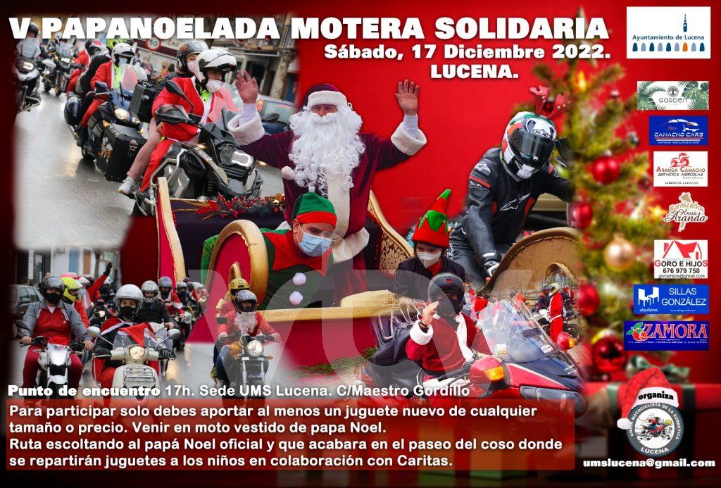 La cita será este sábado, día 17 de diciembre, en una visita de Papá Noel que vuelve a organizar la Unión Motociclista de la Subbética (UMS). A partir de las 17:00 horas, el punto de encuentro para los moteros solidarios, ataviados con el típico traje rojo, será la sede del motoclub, en la calle Maestro Gordillo, desde donde partirá la caravana motera escoltando al trineo de Papá Noel que se paseará por varios barrios de Lucena ciudad para llegar, sobre las 19.00 h., a la Plaza del Coso.