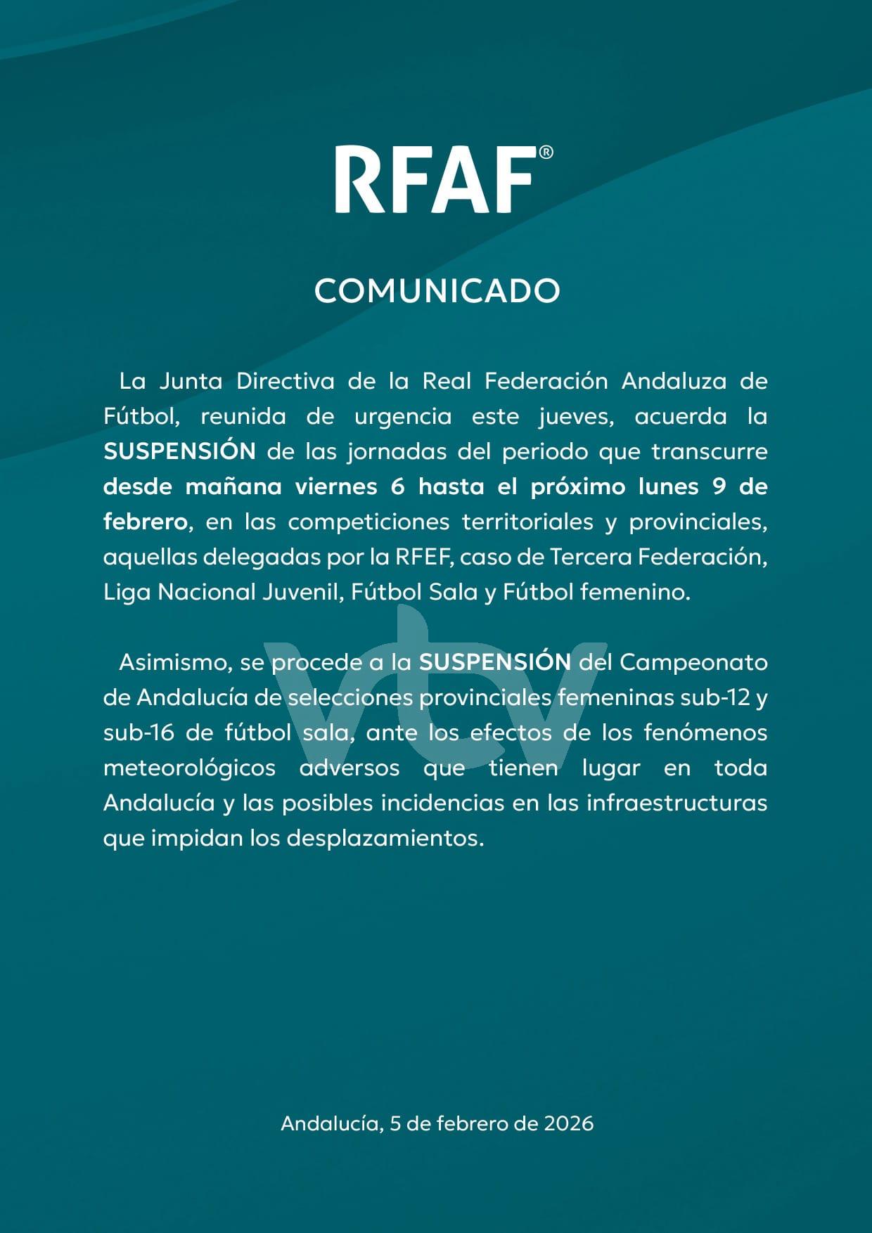 La Real Federación andaluza de fútbol ha emitido el siguiente comunicado anunciando la suspensión de todas la jornada en las diferentes categorías que afectan a: Tercera federación, 1ª nacional, fútbol sala y fútbol femenino.