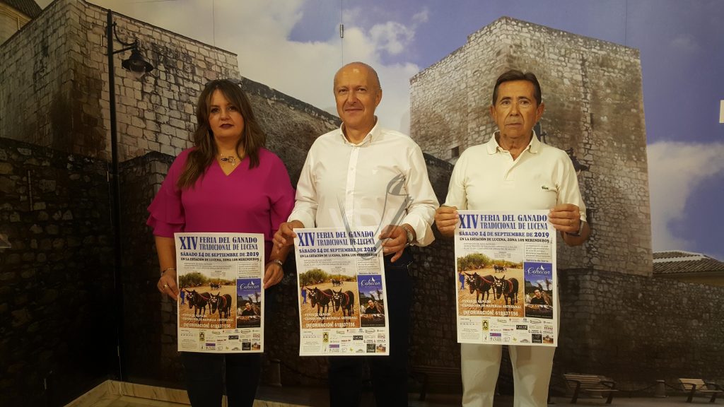 El concejal de Agricultura, Lucas Gómez, y Antonio del Pino y Araceli Sánchez, en nombre del colectivo organizador, han presentado la decimocuarta edición de esta Feria del Ganado Tradicional de Lucena que tiene en el concurso de arrastre de mulos (con premios desde los 200 a 100 euros), en una demostración de esquilado artístico a mulos y en la exhibición de aves rapaces, a cargo de Cetrecor, sus grandes novedades.