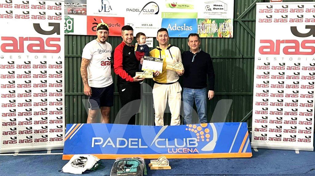 De esta manera, durante esta jornada de convivencia y finalizada la competición, la Gestoría Aras hizo entrega de los premios a los 3 primeros clasificados de cada categoría: La pareja campeona se llevó un trofeo y un cheque regalo de 100 € canjeable en la tienda del Pádel Club Lucena; los subcampeones se adjudicaron un trofeo más un paletero; y los terceros un trofeo y un gymsack
