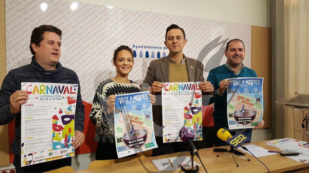 Lucena celebrará el carnaval del 16 al 18 de febrero ampliando así los días dedicados a esta fiesta popular y las actividades que se desarrollarán durante estas tres jornadas. El día 16 a las ocho de la tarde comenzarán en la Plaza Nueva una serie de juegos infantiles y a las nueve de la noche el Palacio Erisana acogerá la representación de la obra “Trece y Martes” de la compañía “La caseta producciones” bajo la dirección de Jordi Aguilera.