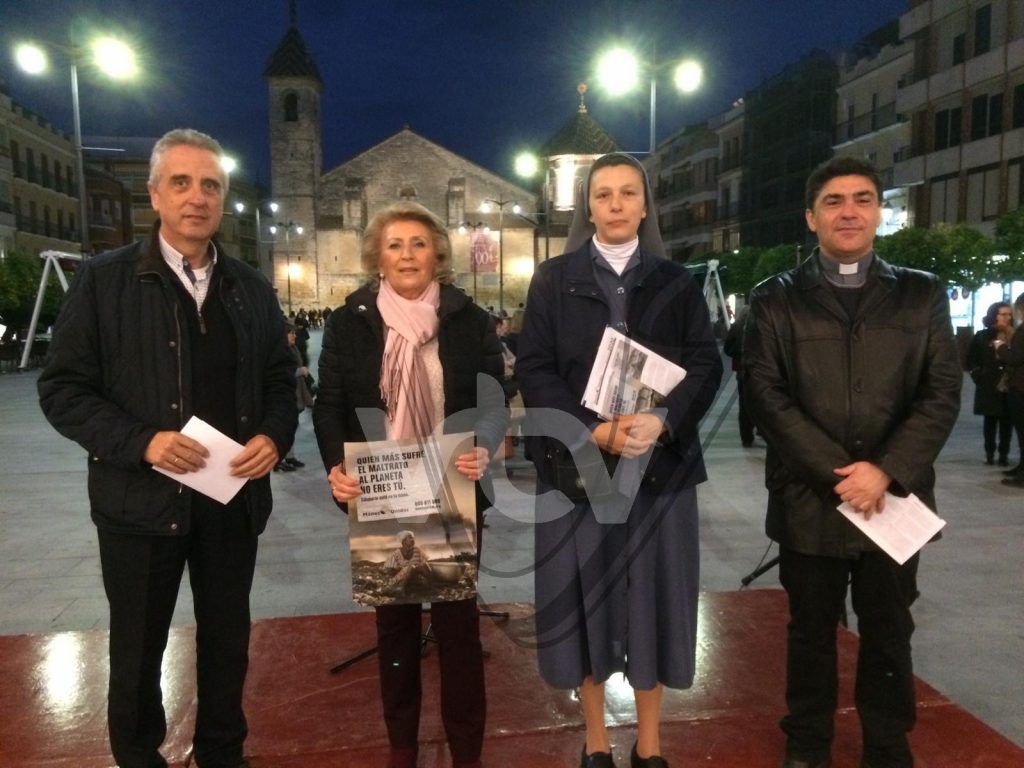 La delegada de Manos Unidas en Lucena, Araceli Delgado, acompañada del Vicario de la Campiña, David Malagón, la misionera Hermana Zunilda y el alcalde de Lucena, Juan Pérez, daban lectura junto con niños de catequesis al manifiesto de Manos Unidas 2020.