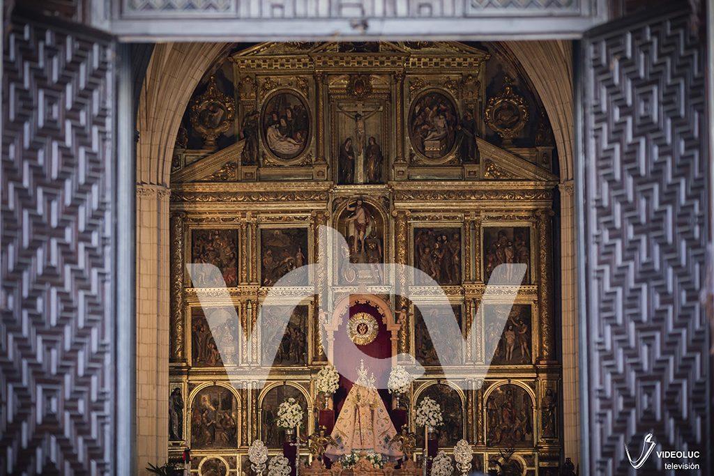 Así apareció María Santísima de Araceli la mañana del domingo de pentecostés, con su terno rosa de los dragones, con el sol coronando su dosel en el altar mayor de la Parroquia de San Mateo.