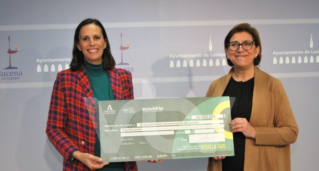 El Ayuntamiento de Lucena ha resultado ganador del primer premio en el concurso medioambiental organizado por Ecovidrio “Recicla, cada envase cuenta”. La Gerente de zona, Coral Rojas, hacía entrega a la concejal delegada de Medio Ambiente, Charo Valverde, del premio, consistente en un taller de sensibilización ambiental que se llevará a cabo en la tarde del próximo viernes en la Plaza Nueva y un cheque de 2.000 euros que según Valverde se destinará a la compra de pequeñas palmeras que se van a ubicar en la zona de la Huerta del Carmen, donde algunas de estas especies han tenido que ser retiradas por plagas del escarabajo picudo.