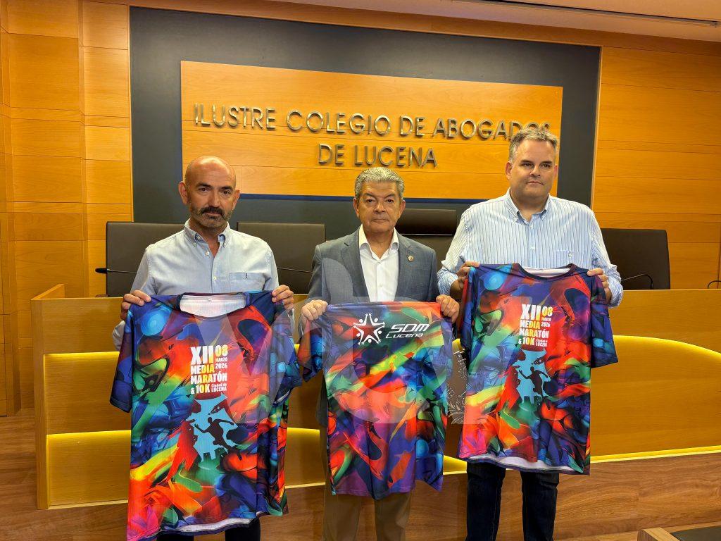 La sede del Ilustre Colegio de Abogados de Lucena ha acogido este miércoles la presentación de la camiseta oficial de la XII Media Maratón y la Carrera Popular 10K, en un acto en el que han participado el concejal de Deportes, Ángel Novillo; el presidente del Club Maratón Lucena y director técnico de la prueba, Pedro Díaz; y el vicedecano del Colegio, José Antonio Vigo.