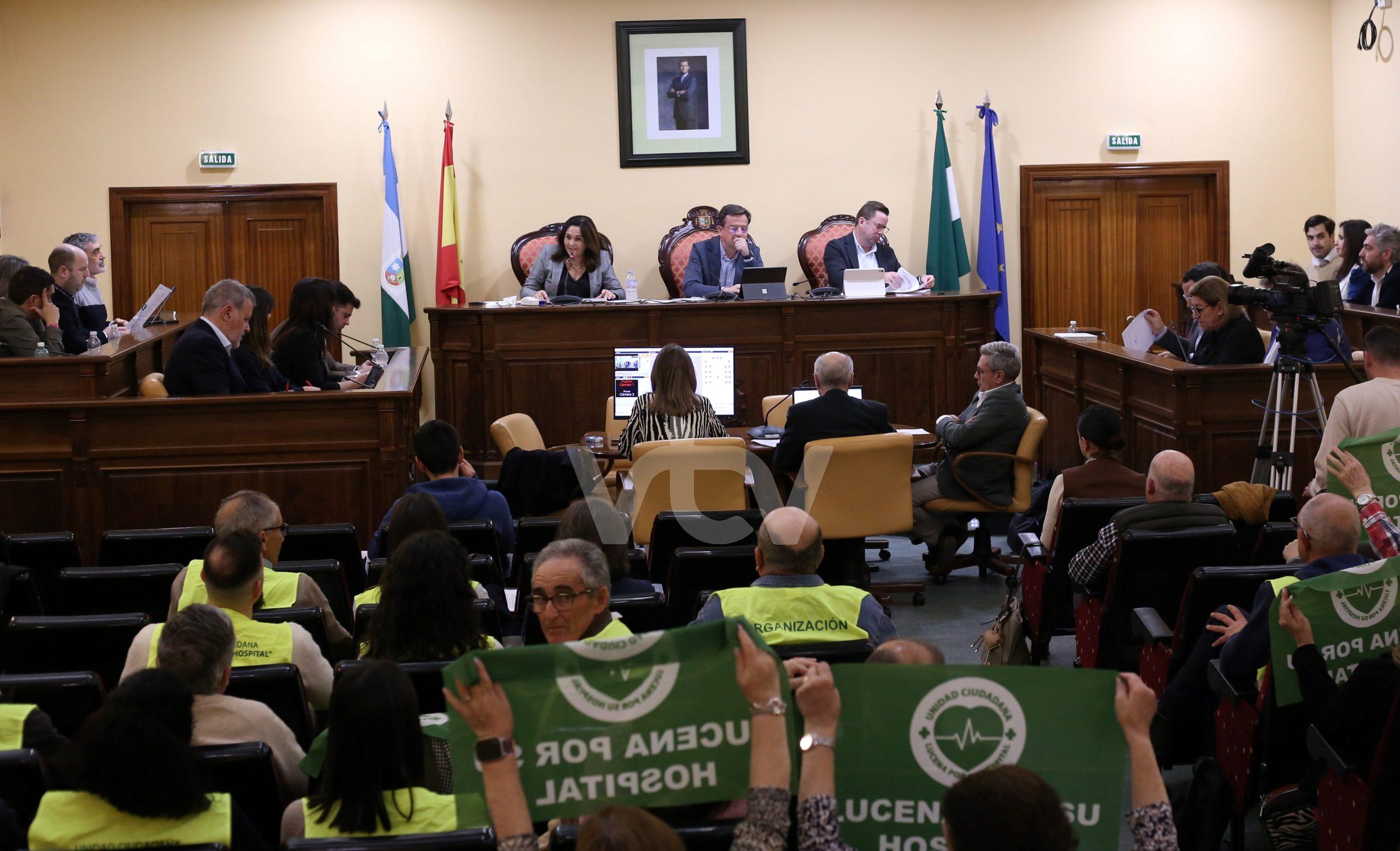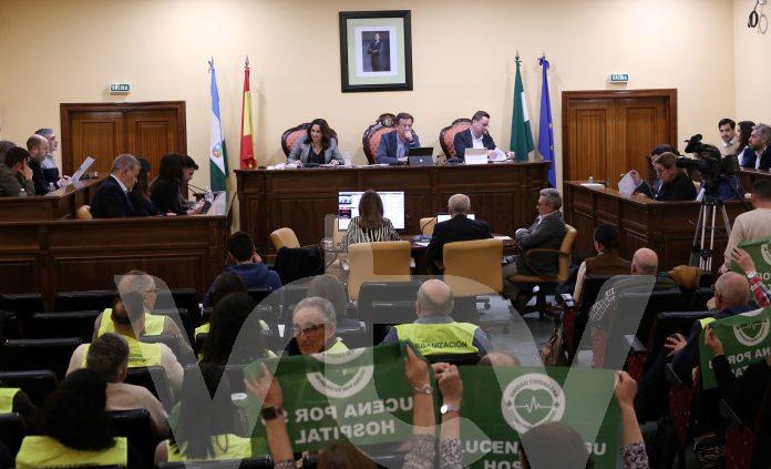 Representantes del Movimiento Ciudadano Lucena por su Hospital se congregaron en el pleno para seguir reivindicando esta infraestructura hospitalaria en la ciudad.