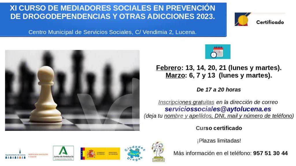El Ayuntamiento de Lucena, a través de la delegación de Servicios Sociales y Salud, convoca la undécima edición del curso de ‘Mediadores Sociales en prevención de drogodependencias y otras adicciones’.