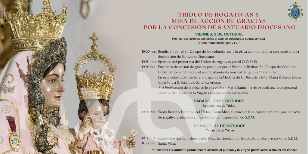 El acto se iniciará con la bendición por parte del Obispo de Córdoba, Demetrio Fernández, de los columbarios y la placa conmemorativa de declaración de Santuario Diocesano, a lo que le seguirá el ejercicio del primer día de Triduo de rogativas por el Covid 19.