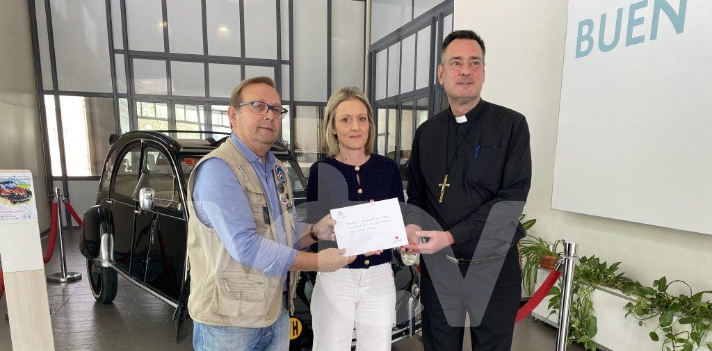 La gerente de Tobalo Lucena María Jesús Martos, junto con José María Abras, presidente de la Asociación de Amigos de la Automoción Antigua hacían entrega a Fernando Martín, Párroco de la Sagrada Familia de los 665 euros recaudados en la Concentración de Vehículos Clásicos que tuvo lugar el pasado domingo.