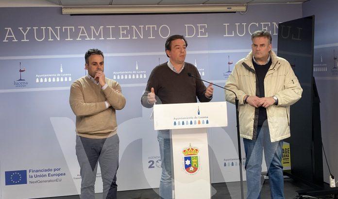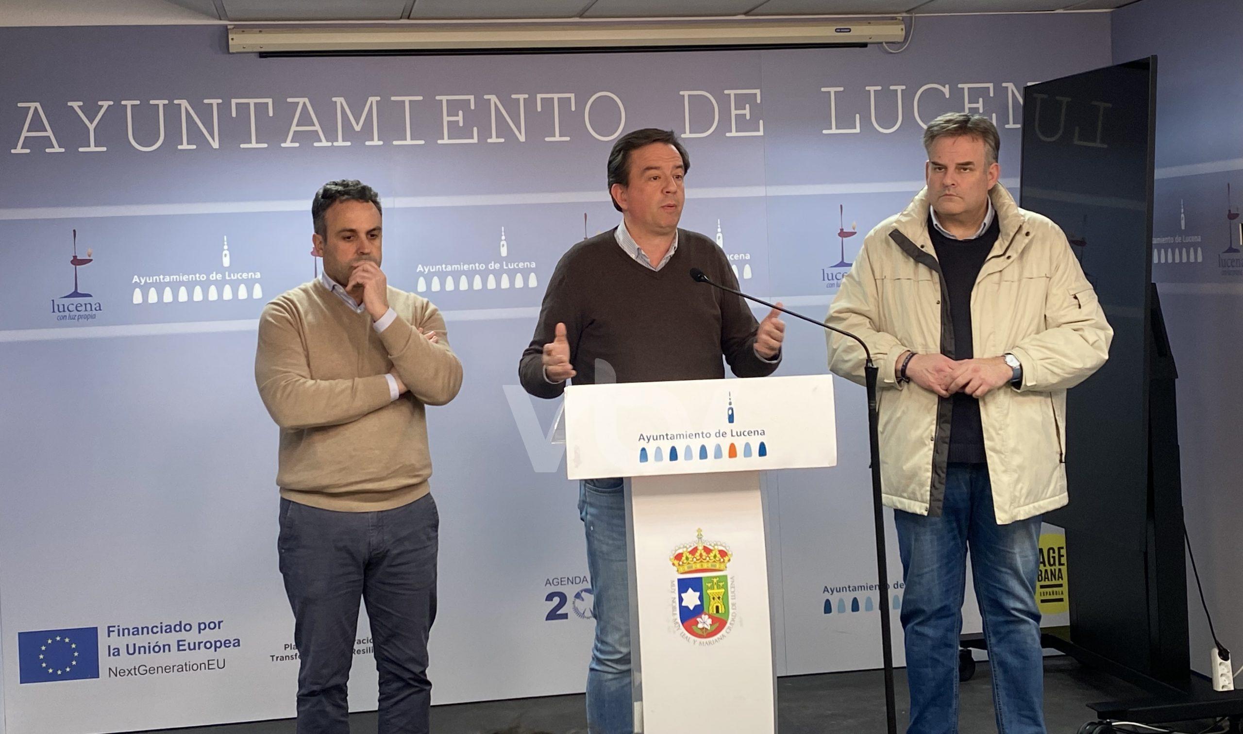El alcalde de Lucena, Aurelio Fernández, ha comparecido ante los medios de comunicación acompañado de los concejales delegados de Seguridad Ciudadana y Servicios Operativos, Ángel Novillo y Javier Pineda, para informar de la situación de Lucena tras la borrasca Leonardo e informar de las medidas a seguir.